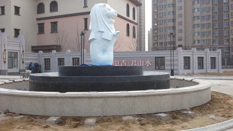 烟台中青君山水小区 鱼尾狮雕塑水景 材质:不锈钢