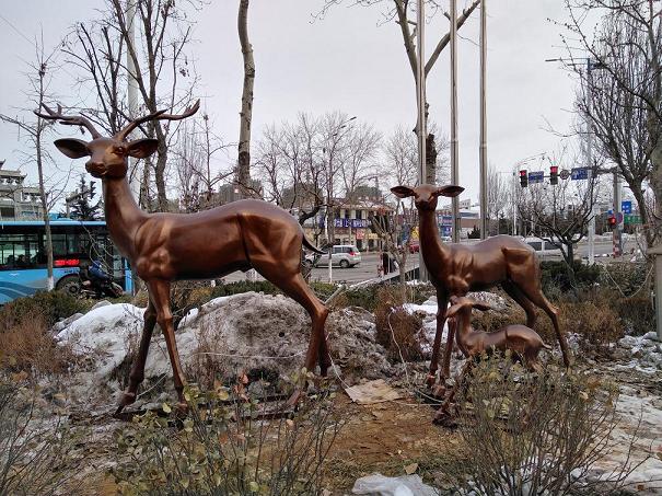 鹿在中国文化中寓意“禄”,是神兽之一,和福禄寿星为伍。酒店的标志为鹿,因此设计制作鹿群,公鹿母鹿小鹿各一,公鹿居前,昂首环视。小鹿仰望母鹿,母鹿稍警觉四周,表现整体互动和个体特点。